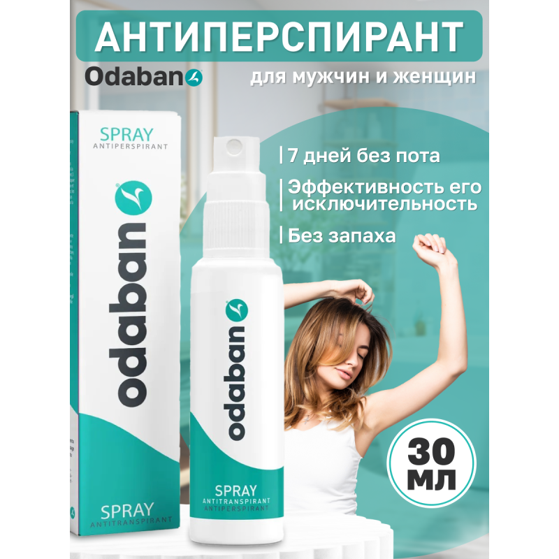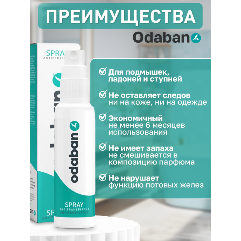 Купить антиперспирант без белых следов Одабан можно в нашем интернет-магазине. Одного флакона с пульверизатором хватает на шесть месяцев. Нанося небольшое количество средства на ночь, вы обеспечите себя защитой от пота и запаха минимум на 3-4 дня.