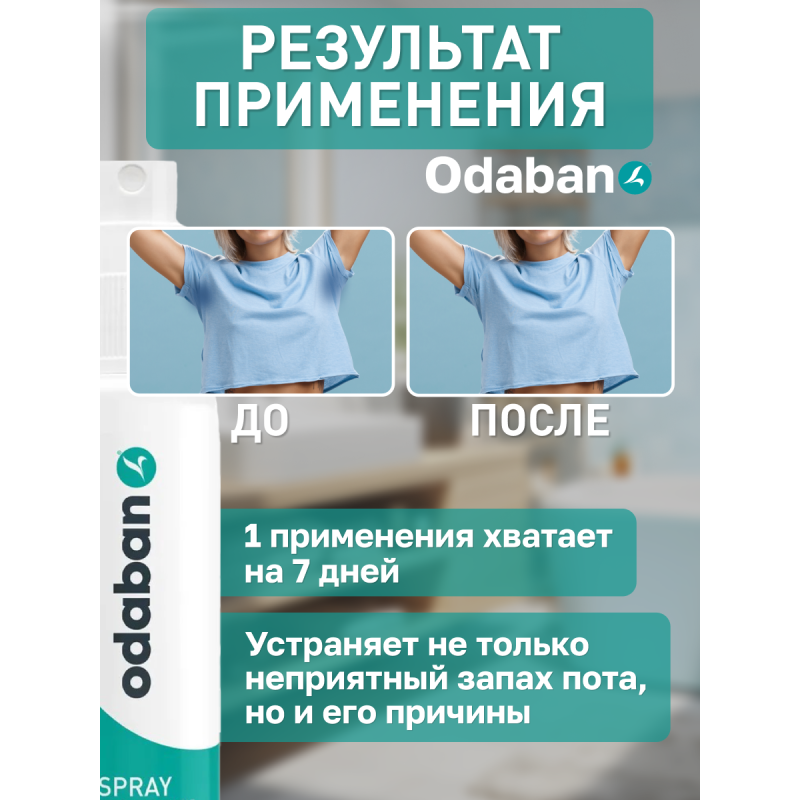 Способ применения: Антиперспирант Одабан в форме спрея предназначен для нанесения на любые участки тела, в том числе и на лицо. Потоотделение заметно снижается уже после первого применения, а при регулярном использовании на ночь спрея-антиперспиранта достигается устойчивый положительный результат.